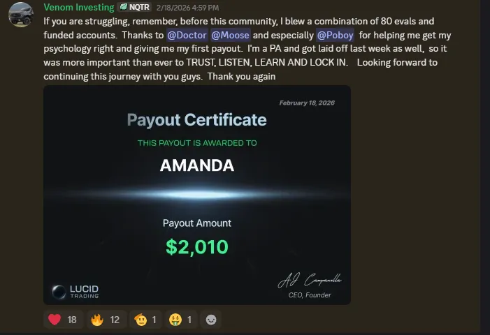 You’re joining a focused group of serious, like‑minded traders who share ideas and push each other to improve. The culture is built around accountability, growth, and becoming the best trader—and person—you can be